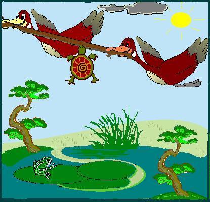 Once upon a time, there lived two ducks and a turtle in a pond. They were good friends and always helped each other. One summer the pond dried up. The ducks decided to leave and go to another pond. The turtle understood that he would miss his friends and became sad. The turtle said: Like yourselves, living in this dry pond is hard for me and I also wouldn’t like to miss you. Do something and take me with you? The ducks thought for sometime and then they said: We will take you if you promise to accept what we are going to ask you to do. They then brought a bamboo. We will hold the bamboo with our beaks and you have to bite in the middle of the bamboo and hang on yourself, the ducks said. Then we can fly, but you mustn’t open your mouth at all. The turtle accepted, and held onto the bamboo by its mouth, and the ducks started to fly. The frog saw the flying turtle and was amazed. Look at that, everybody, a turtle is flying, frog shouted. |